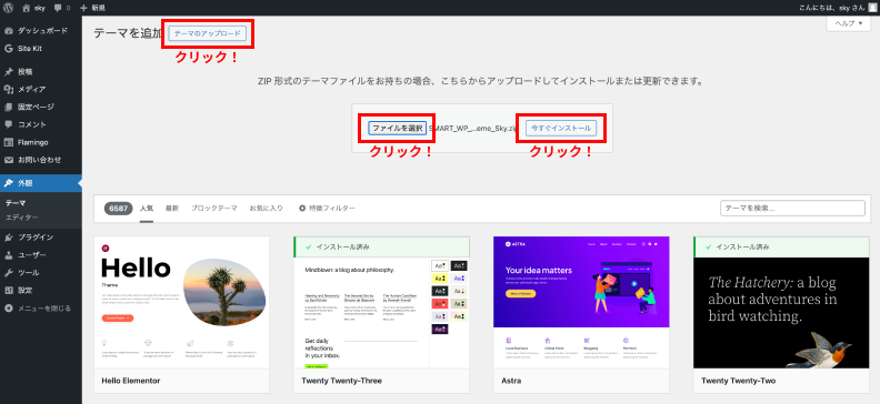 ・「ファイルを選択」ボタンをクリックし、ダウンロードしたテーマのzipファイルを選択します。