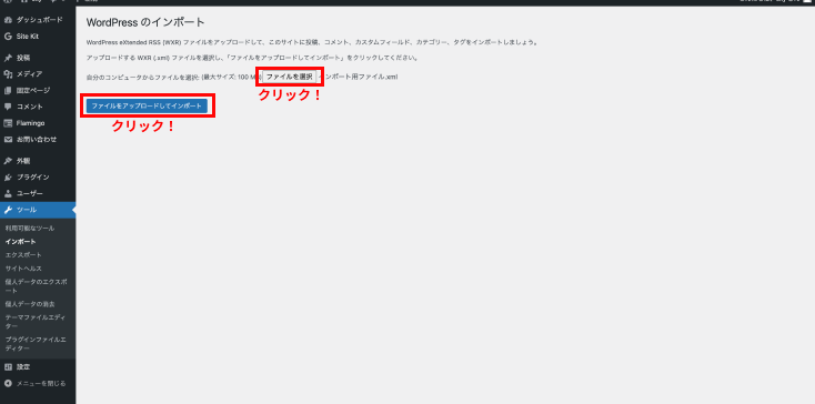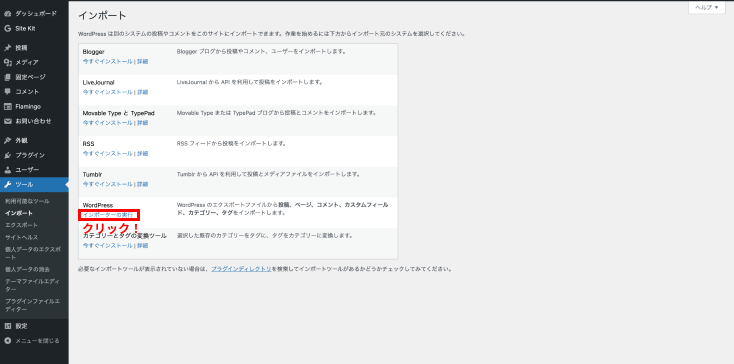 ・ダッシュボードの左メニューから「ツール」>「インポート」をクリックします。