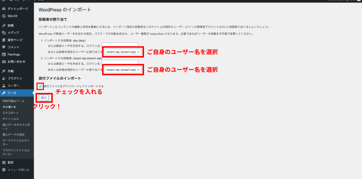 ・インポート時に、投稿者を割り当てるオプションがあります。ご自身のユーザーを選択してください。