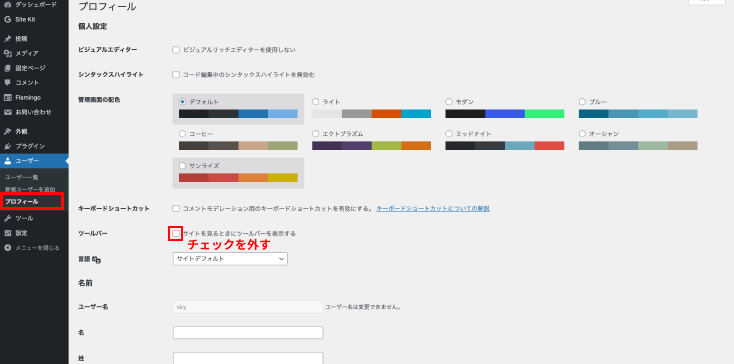 ・ダッシュボードの左メニューから「ユーザー」>「プロフィール」をクリックします。