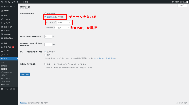・「ホームページの表示」セクションで「固定ページ」を選択します。